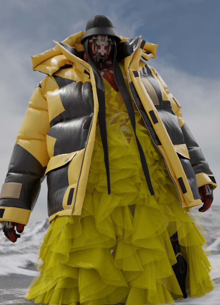 The third is the "future" state, represented in a real-time AR form, visually abstracted from the previous silhouette, which was determined by the functional aspect of the clothing. What remains is fashion alone, which is not dependent on anything: fashion is liberated and transcended into a new level. Its owner can wear the item as a real-time AR skin via Tribute Brand's YCY mobile app.