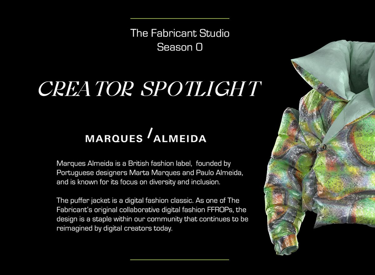 In an earlier article I wrote about "Iridescence" as a starting point on their efforts. Nevertheless The Fabricant is constantly pushing the boundaries and lately announced "The Studio" Season #0 β a possibility to co-create with a curated group of creators, brands and designers. Currently 50 invitees are busy co-creating itβs debut collection and minting limited edition fashion NFTs. The royalties are equally split across all creators involved.
