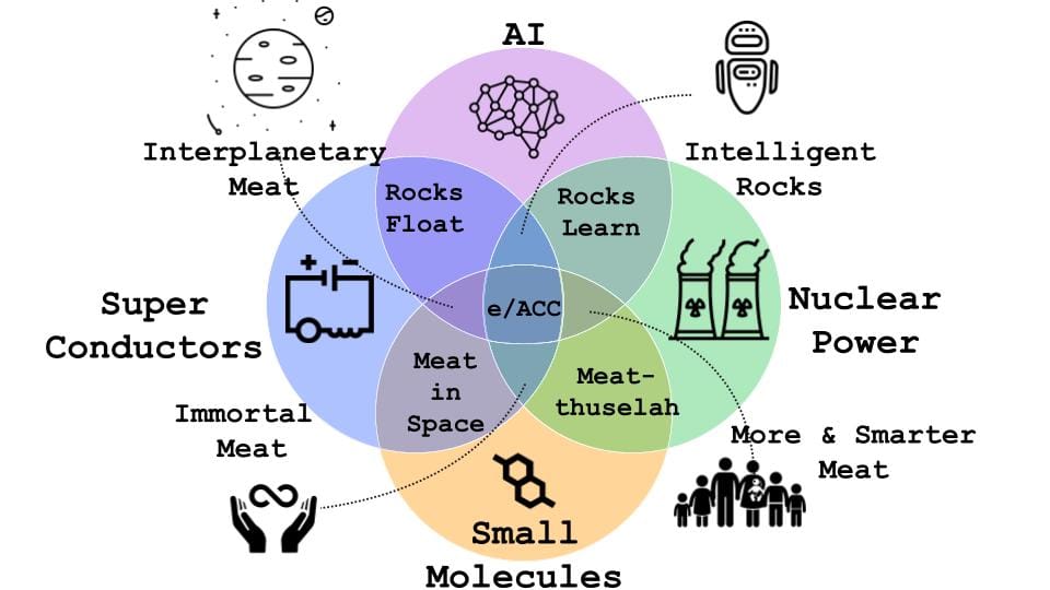 e/acc nests within TESCREAL (transhumanism, extropianism, singularitarianism, cosmism, rationalism, EA, longtermism), but rejects degrowth's "decel" vibes. Unlike degrowth's consumption cuts, e/acc demands energy spirals upward.